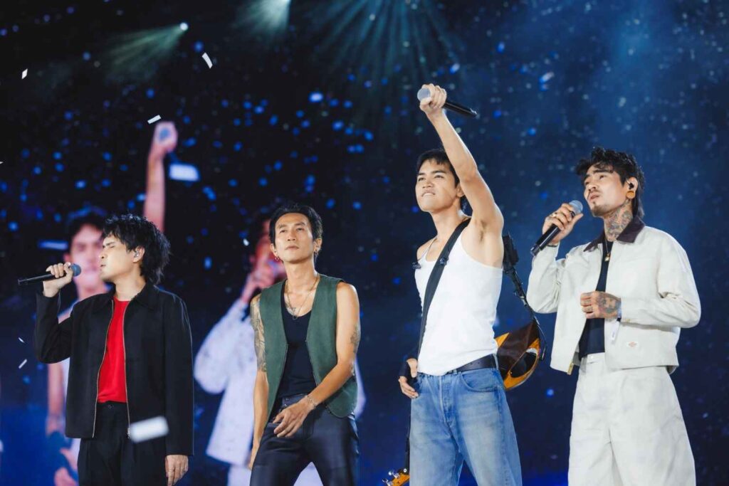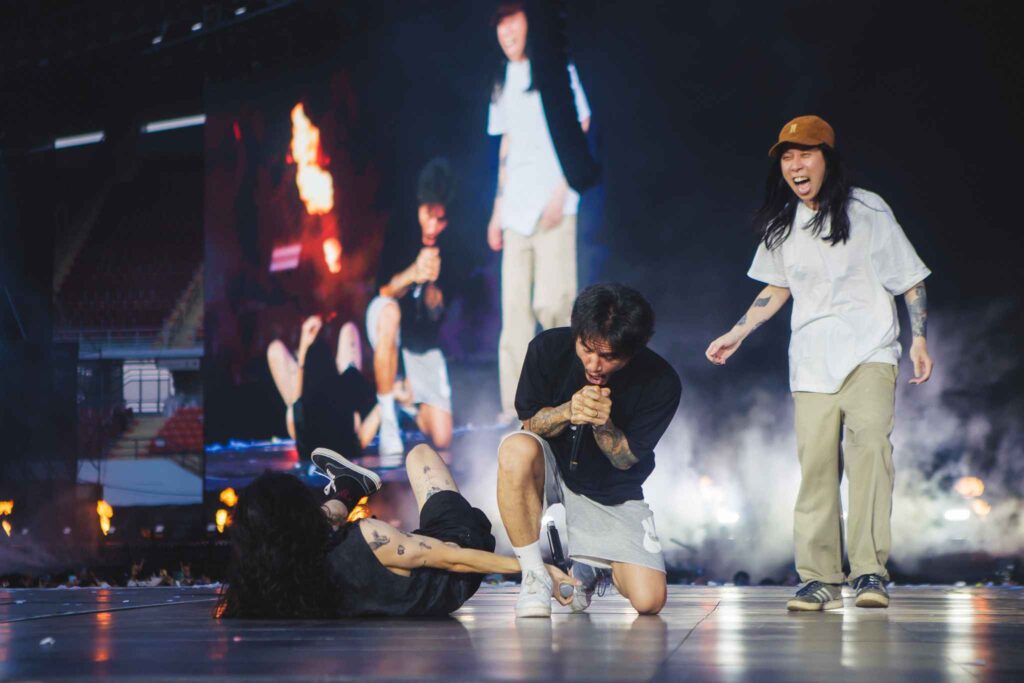 อีกช่วงที่กินใจคือซีน “คนไกลบ้าน” ตัวแทนศิลปินต่างจังหวัดอย่าง โจอี้, เข้ม FREEHAND, เล็ก รัชเมศฐ์ และ Bodyslam ร่วมส่งพลังผ่านเพลง “ใจกลางเมือง” และ “ทุกคนเคยร้องไห้” ทำให้ราชมังฯ เงียบสงบชั่วขณะก่อนกลับมาลุกเป็นไฟอีกครั้ง
