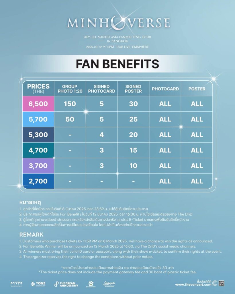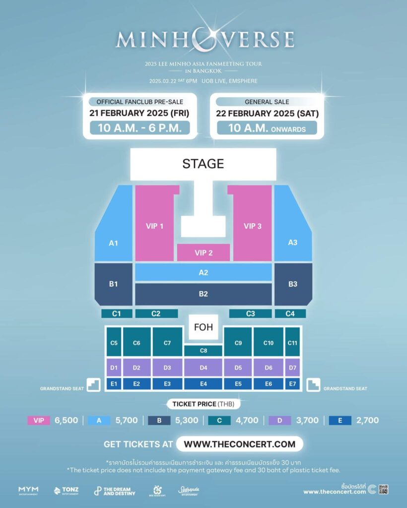 เตรียมตัวเตรียมหัวใจของคุณให้พร้อม แล้วมาเจอกับ LEE MINHO’ ที่เป็นรักแรกและรักปัจจุบันของหลายๆ คนในงาน 2025 LEE MINHO ASIA FANMEETING TOUR ‘MINHOVERSE IN BANGKOK’ บัตรราคา :  6,500 / 5,700 / 5,300 / 4,700 / 3,700 และ 2,700 บาท (ราคาบัตรไม่รวมค่าธรรมเนียมการชำระเงิน และ ค่าธรรมเนียมบัตรแข็ง 30 บาท) ไม่ได้เจอกันนานขนาดนี้ รับรองว่าแฟนมีตติ้งครั้งนี้ LEE MINHO’ จัดให้เต็มทั้งความรัก ความสนุกแบบพิเศษอย่างแน่นอน