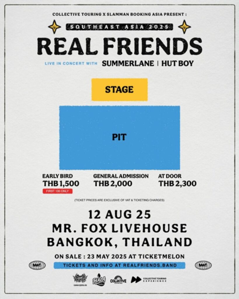 วงดนตรีแนวอีโม/ป็อปพังก์สัญชาติอเมริกัน Real Friends เตรียมออกทัวร์คอนเสิร์ตในเอเชียตะวันออกเฉียงใต้ปีนี้ หนึ่งในนั้นมีประเทศไทยด้วย! พวกเขาจะทำการแสดงสด 6 รอบ ได้แก่ อินโดนีเซีย สิงคโปร์ ไทย เวียดนาม และฟิลิปปินส์ พร้อมกันนี้ยังมีศิลปินวงไทยอย่าง HutBoy ที่จะเล่นเปิดให้กับ Real Friends ด้วย โดยการแสดง REAL FRIENDS LIVE IN BANGKOK 2025 จะจัดขึ้นในวันอังคารที่ 12 สิงหาคม 2025 ที่ MR.FOX LIVE HOUSE สามารถซื้อบัตรได้แล้วที่ https://www.ticketmelon.com/slammanbookingasia/real-friends-live-in-bkk-2025