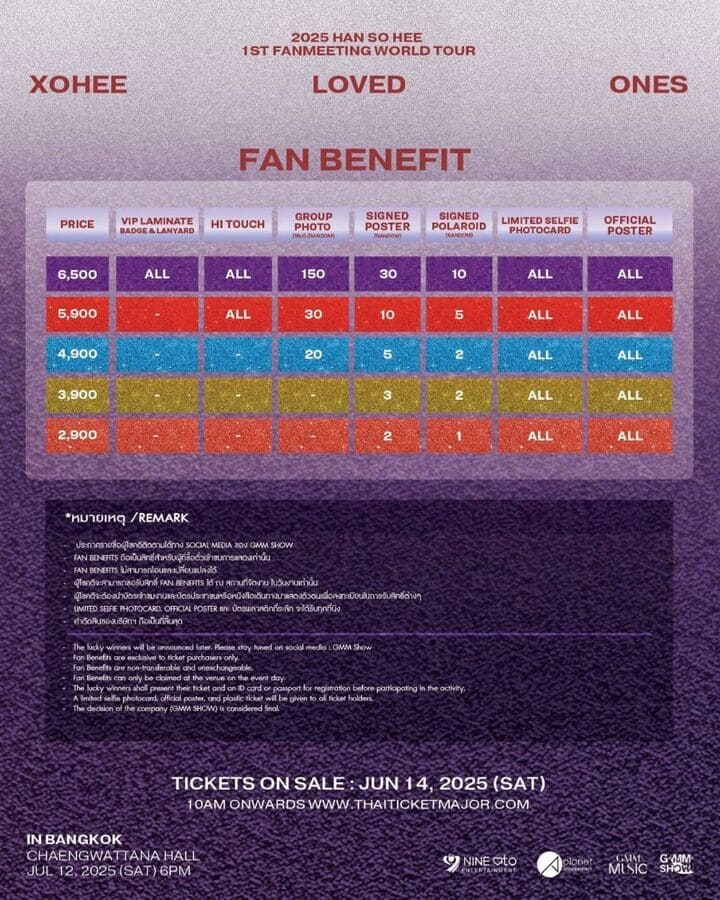เตรียมมือ เตรียมเน็ตให้พร้อม ลุ้นรับสิทธิ์แฟนเบเนฟิต ราคาบัตร 6,500 / 5,900 / 4,900 / 3,900 / 2,900 บาท กดบัตรผ่านเว็บไซต์ www.thaiticketmajor.com ในวันเสาร์ที่ 14 มิถุนายน 2568 เวลา 10.00 น. เป็นต้นไป ติดตามรายละเอียดเพิ่มเติมได้ทาง Facebook: GMM SHOW / TikTok: @gmmshow / Instagram: @gmmshow / X: @GMMSHOW_th