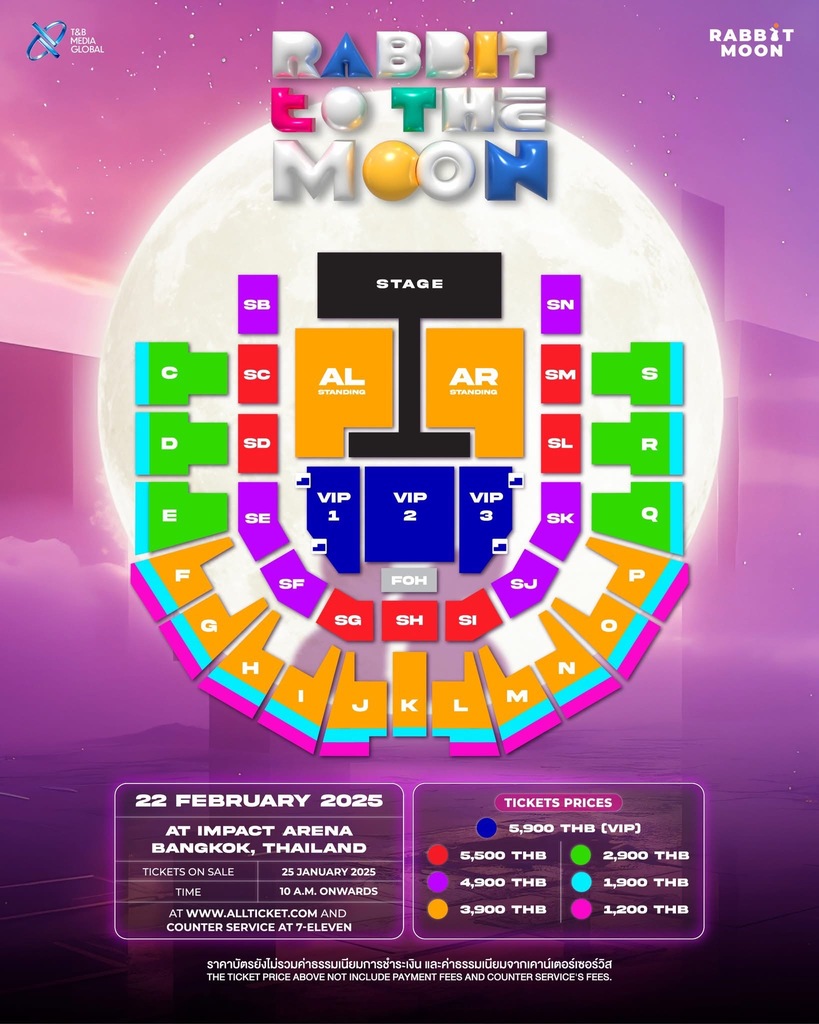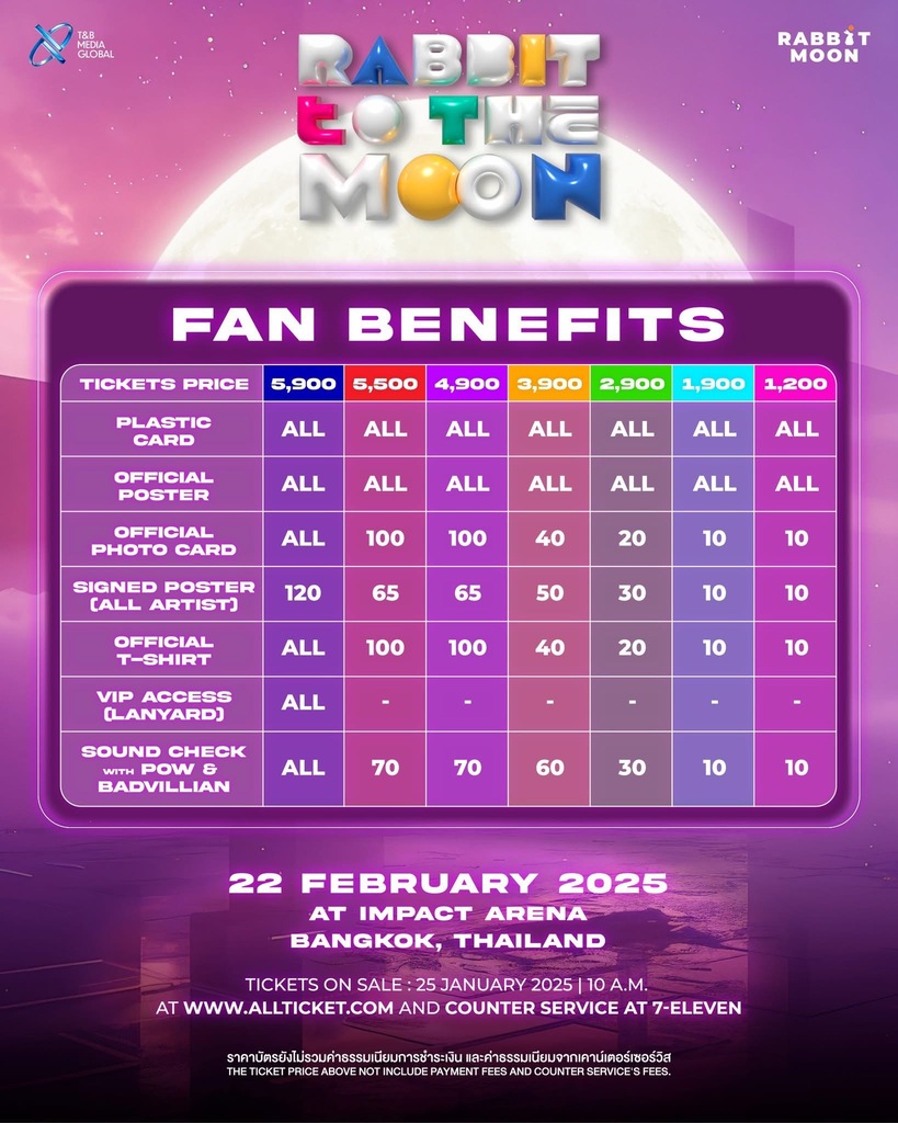 สำหรับแฟนของทุกศิลปิน ห้ามพลาดไป สนุก ไป มันส์ ร่วมเดินทางสู่ดวงจันทร์ด้วยกันในเทศกาลดนตรี K-POP แห่งปี “RABBIT TO THE MOON 2025” เปิดจำหน่ายบัตรแล้ววันนี้ ที่ www.allticket.com และ เคาน์เตอร์เซอร์วิสในร้าน 7-Eleven ทุกสาขาทั่วไทย บัตรราคา 5900 ,5500 , 4900 , 3900 , 2900 , 1900 และ 1200 บาท พร้อม FAN BENEFITS ครบทุกโซน โดยสามารถติดตามความข้อมูลและเคลื่อนไหวได้ที่ FB:IG:X : Rabbit To The Moon