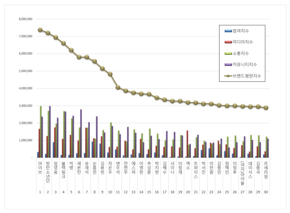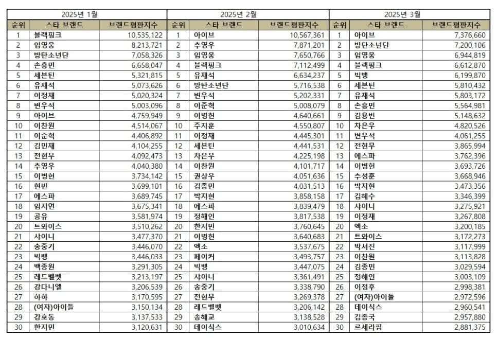 วงการบันเทิงแดนกิมจิยังคงคึกคักอย่างต่อเนื่อง เมื่อล่าสุด สถาบันวิจัยธุรกิจแห่งเกาหลี (Korean Business Research Institute) ได้เผยอันดับ “Brand Reputation” ของเหล่าคนดังในเดือนมีนาคม โดยวิเคราะห์จากการมีส่วนร่วมของผู้บริโภค การนำเสนอในสื่อ การมีปฏิสัมพันธ์ และการรับรู้ของชุมชน โดยใช้บิ๊กดาต้าที่เก็บรวบรวมระหว่างวันที่ 28 กุมภาพันธ์ – 29 มีนาคม