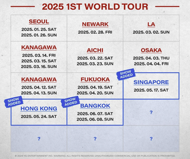 YG Entertainment ประกาศข่าวดีในวันที่ 6 มกราคมว่า BABYMONSTER เกิร์ลกรุ๊ปดาวรุ่ง จะขยายเวิลด์ทัวร์เดบิวต์สู่เอเชีย โดยเพิ่ม 4 โชว์พิเศษในสิงคโปร์ (17 พ.ค.), ฮ่องกง (24 พ.ค.) และกรุงเทพฯ (7-8 มิ.ย.) ปี 2025