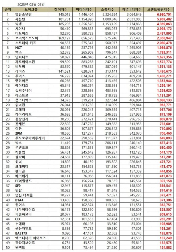 วงการไอดอลชายเดือดเป็นไฟอีกครั้ง เมื่อ The Korean Business Research Institute ประกาศ อันดับบอยกรุ๊ปที่มีอิทธิพลต่อแบรนด์มากที่สุดประจำเดือนมีนาคม 2025 งานนี้ผลวิเคราะห์จาก Big Data ที่เก็บระหว่างวันที่ 8 กุมภาพันธ์ – 8 มีนาคม เผยให้เห็นถึงกระแสของไอดอลที่กำลังมาแรง ทั้งจาก การมีส่วนร่วมของผู้บริโภค, การรายงานของสื่อ, การโต้ตอบ และดัชนีชุมชน