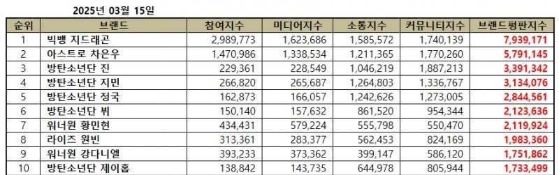 สถาบันวิจัยธุรกิจเกาหลี (Korean Business Research Institute) เผยอันดับความนิยมของสมาชิกบอยกรุ๊ปประจำเดือนล่าสุด (ก.พ. – มี.ค.) โดยวิเคราะห์จากข้อมูลขนาดใหญ่ (Big Data) ที่รวบรวมจากการมีส่วนร่วมของผู้บริโภค การถูกพูดถึงในสื่อ การสื่อสาร และการรับรู้ของสังคม ซึ่งในครั้งนี้ G-Dragon แห่ง BIGBANG กลับมาทวงบัลลังก์แชมป์อย่างสมศักดิ์ศรี ด้วยดัชนีความนิยมสูงถึง 7,939,171 คะแนน เพิ่มขึ้นจากเดือนก่อนถึง 40.36%