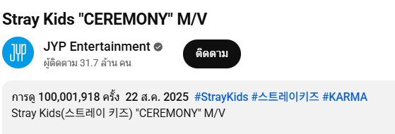 ที่น่าจับตาไม่แพ้กันคือระยะเวลาการเติบโตของยอดวิว เพราะหลังจากปล่อย MV “CEREMONY” อย่างเป็นทางการเมื่อวันที่ 22 สิงหาคม เวลา 13.00 น. (KST) เพลงนี้ใช้เวลาเพียง ประมาณ 163 วัน เท่านั้นในการพุ่งสู่หลักร้อยล้าน ซึ่งสะท้อนถึงพลังฐานแฟนคลับระดับโลกของ Stray Kids ที่ยังคงแข็งแกร่ง และพร้อมซัพพอร์ตทุกผลงานแบบไม่มีคำว่าเบรก