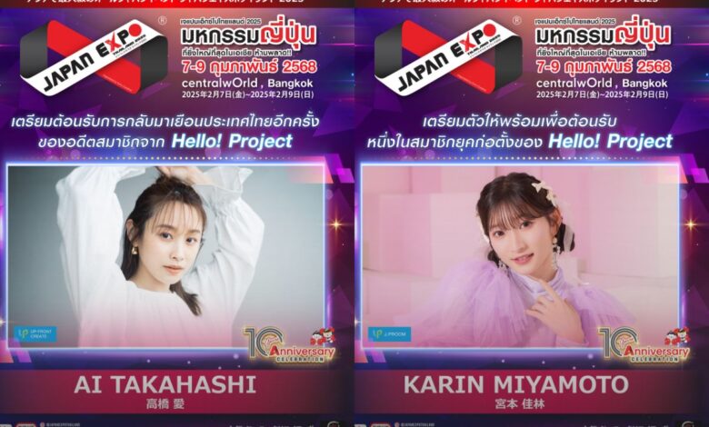 JAPAN EXPO THAILAND 10 ปี ทั้งที พบกับศิลปินจากค่าย Hello! Project กลับมาร่วมงานอีกครั้ง อดีตสมาชิกจาก Hello! Project  “AI TAKAHASHI (ไอ ทาคาฮาชิ)” และ ครั้งแรก! ของหนึ่งในสมาชิกยุคก่อตั้ง Hello! Project  “KARIN MIYAMOTO  (คาริน มิยาโมโตะ)”  ที่จะมาสร้างสีสันในงาน JAPAN EXPO THAILAND 2025 ร่วมเฉลิมฉลองครบรอบ 10 ปี  เตรียมตัวมาพบกับความน่ารักของทั้ง 2 ศิลปิน อย่างใกล้ชิดที่จะมามอบความสดใสให้ทุกคนภายในงาน และกิจกรรมสุดพิเศษ Exclusive Fan Meeting ติดตามรายละเอียดได้เร็ว ๆ นี้!