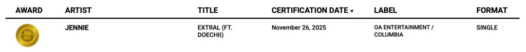 วงการเพลงสหรัฐฯ ต้องสั่นสะเทือนอีกระลอกเมื่อ Jennie สมาชิกเกิร์ลกรุ๊ประดับโลก BLACKPINK ปิดปีด้วยผลงานระดับมาสเตอร์ เพราะล่าสุดซิงเกิลสุดจี๊ด “ExtraL” ที่จับมือกับแร็ปเปอร์ตัวแม่ Doechii ได้รับการรับรอง RIAA Gold อย่างเป็นทางการ หลังยอดขายรวมทะลุ 500,000 ยูนิตในอเมริกา แบบไม่ต้องพึ่งโชคชะตา