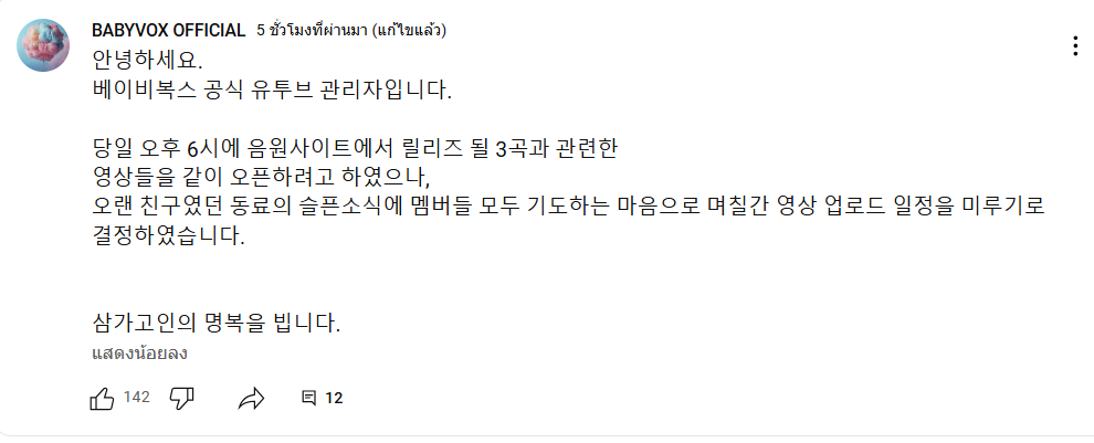 เมื่อไม่นานมานี้ Baby VOX ได้เตรียมปล่อยคอนเทนต์พิเศษที่แฟนๆ รอคอย แต่แล้วทุกอย่างก็ต้องถูกเลื่อนออกไปแบบไม่ทันตั้งตัว โดยต้นสังกัดเผยผ่านแถลงการณ์ว่า “เราขอแสดงความเสียใจอย่างสุดซึ้งกับการจากไปของเพื่อนร่วมงานคนสำคัญของเรา เพื่อเป็นการเคารพต่อบุคคลดังกล่าว เราจึงขอเลื่อนการเผยแพร่คลิปเพลงที่วางแผนไว้ในช่วงเวลานี้”