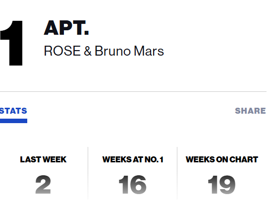 เรียกว่าปังไม่ไหว หยุดความฮอตไม่ได้จริง ๆ สำหรับ “APT.” ซิงเกิลสุดต๊าชของ โรเซ่ ที่แท็กทีมตัวพ่อเสียงละมุน Bruno Mars ล่าสุดพาเพลงนี้เด้งกลับขึ้นอันดับ 1 บน Billboard Global Excl. U.S. Chart ประจำสัปดาห์ที่ 19 ในวันที่ 5 มีนาคมอีกครั้ง! นี่คือการยึดแชมป์ครั้งที่ 16 แถมทำสถิติใหม่เป็นเพลงที่ครองอันดับ 1 บนชาร์ตนี้ยาวนานที่สุดในประวัติศาสตร์ เรียกว่าจารึกชื่อกันไปเลย