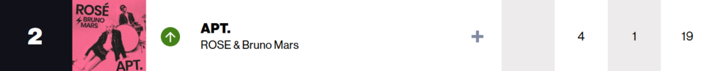 ฝั่งยอดขายดิจิทัลก็ไม่แผ่ว APT. ยืนหนึ่งต่อเนื่องใน Digital Song Sales Chart ที่อันดับ 9 และไต่ขึ้นอันดับ 13 บนชาร์ตสตรีมมิ่ง Streaming Songs Chart พูดได้คำเดียวว่าโกยทุกทางไม่มีเหลือ