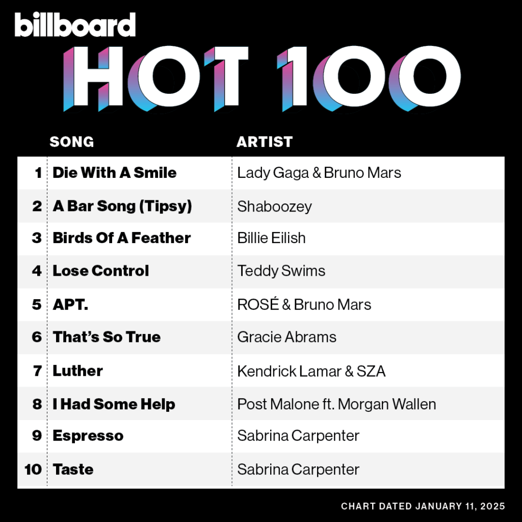 Lady Gaga ป็อปไอคอน Mother Monster เจ้าของ 13 รางวัลแกรมมี่ ส่งสัญญาณความปังรับปีใหม่ ด้วยการขึ้นครองอันดับ 1 ชาร์ต Billboard Hot 100 กันตั้งแต่สัปดาห์แรกของปี 2025 ร่วมกับ Bruno Mars ในเพลงบัลลาดแห่งปี “Die With A Smile” หลังจากที่เพลงนี้เปิดตัวในชาร์ตครั้งแรกด้วยอันดับ 3 และเคยขึ้นไปสูงสุดที่อันดับ 2 ก่อนจะครองตัวอยู่ในชาร์ตอย่างเหนียวแน่นไม่หลุดไปไหนกว่า 20 สัปดาห์ จนหมดเทศกาลวันหยุดที่เหล่าเพลงคริสต์มาสทยอยถอนตัวออกจากชาร์ตไป เพลง “Die With A Smile” ก็พุ่งทะยานจากอันดับที่ 17 ยึดตำแหน่งอันดับ 1 ประจำสัปดาห์แรกของปีนี้ได้เป็นผลสำเร็จ พิสูจน์ให้เห็นถึงความนิยมของเพลงนี้ที่ยังคงฮอตฮิตติดลมบนไม่หมดกระแสลงง่ายๆ สมกับเป็นเพลงแห่งปีจริง ๆ