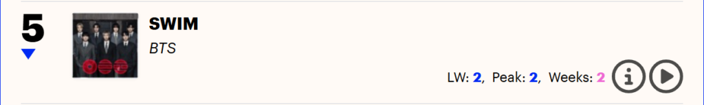 BTS ยังเดินหน้าเก็บแต้มบนชาร์ตสหราชอาณาจักรได้อย่างสวยงามในสัปดาห์ที่สองของการปล่อยผลงานใหม่ โดยชาร์ตสัปดาห์ 3–9 เมษายน 2026 ระบุว่าอัลบั้ม “ARIRANG” อยู่ที่อันดับ 4 บน Official Albums Chart ขณะที่ซิงเกิล “SWIM” ร่วงลงมาเล็กน้อยแต่ยังเกาะอยู่ในท็อป 5 ที่อันดับ 5 บน Official Singles Chart