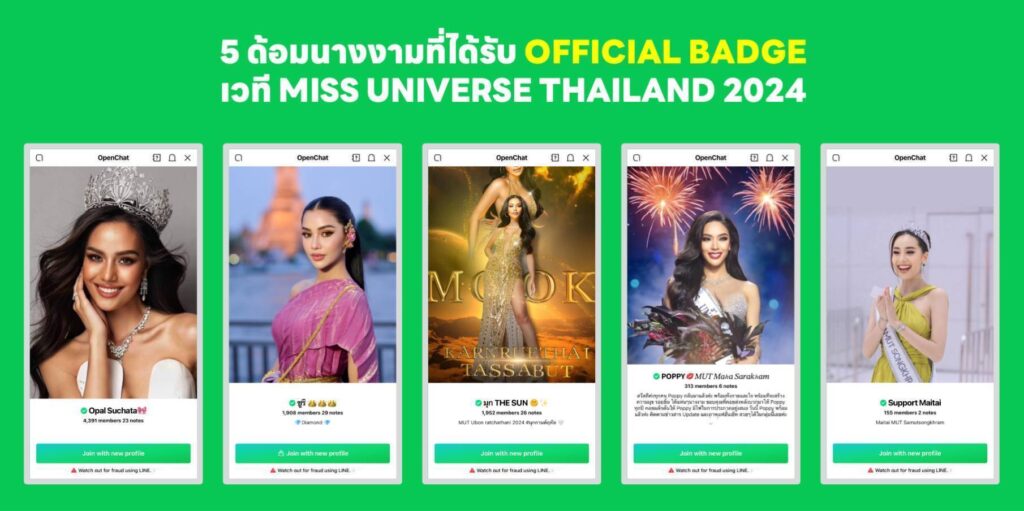 ล่าสุด LINE OpenChat ออก Official Badge เครื่องหมายถูกสีเขียวหน้าชื่อห้องโอเพนแชท เพื่อรับรองห้องนั้นๆ มีเหล่านางงามและทีมงานเป็นผู้ดูแลห้องด้วยตัวเอง ประเดิมหมวดนี้ด้วย 5 ด้อมนางงามจากเวที Miss Universe Thailand 2024 ได้แก่ โอปอล-สุชาตา ช่วงศรี, ซูริ-ซูซานน่า เรโนล, มุก-กานต์ฤทัย ทัศบุตร, ป๊อปปี้-บุญญิสา จันทราราชัย และ ไหม-ไหมไทย สุริยะยรรยง นอกจากนี้ การมีคอมมูนิตี้ยังช่วยเป็นช่องทางให้ทีพีเอ็นฯ สามารถรับฟังเสียงของแฟน ๆ โดยตรง เพื่อนำความคิดเห็นไปพัฒนาการจัดการต่างๆ ให้เข้าถึงเป้าหมายได้ดียิ่งขึ้น