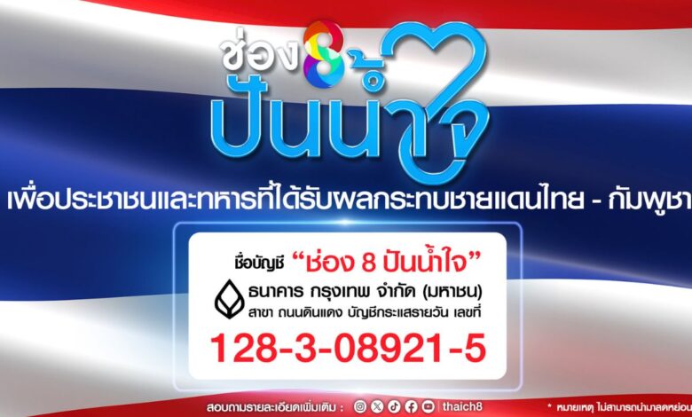 ช่อง 8 ขอเชิญชวนประชาชนทั่วประเทศร่วมเป็นส่วนหนึ่งในการแบ่งปันน้ำใจ เพื่อส่งต่อกำลังใจและความช่วยเหลือให้กับผู้ที่ยังต้องการการเยียวยาในพื้นที่ชายแดนไทย–กัมพูชา ร่วมส่งต่อความช่วยเหลืออย่างเร่งด่วนด้วยทุนทรัพย์ของท่านได้ที่ บัญชี : ช่อง 8 ปันน้ำใจ ธนาคาร : บมจ.ธนาคารกรุงเทพ สาขา ถนนดินแดง บัญชีกระแสรายวันเลขที่ : 128-3-08921-5 เท่านั้น