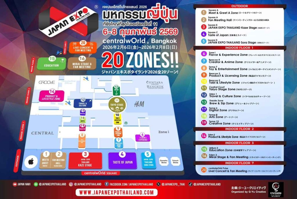 JAPAN EXPO THAILAND 2026 – 11 ปีแห่งความสัมพันธ์ไทยญี่ปุ่น โดยJAPAN EXPO THAILAND ก้าวเข้าสู่ปีที่ 11 อย่างยิ่งใหญ่ ภายใต้ธีม “Japan Thai United as One – ญี่ปุ่นไทยรวมใจเป็นหนึ่งเดียว” รวบรวมความเป็นญี่ปุ่นในทุกมิติทั้งวัฒนธรรม ดนตรี แฟชั่น อาหาร เกม และเทคโนโลยี Soft Power จากญี่ปุ่นสู่ใจกลางกรุงเทพฯ ระหว่างวันที่ 6 – 8 กุมภาพันธ์ 2569 ณ ศูนย์การค้าเซ็นทรัลเวิลด์ ตั้งแต่เวลา 10.00 – 21.00 น. เต็มอิ่มตลอด 3 วัน