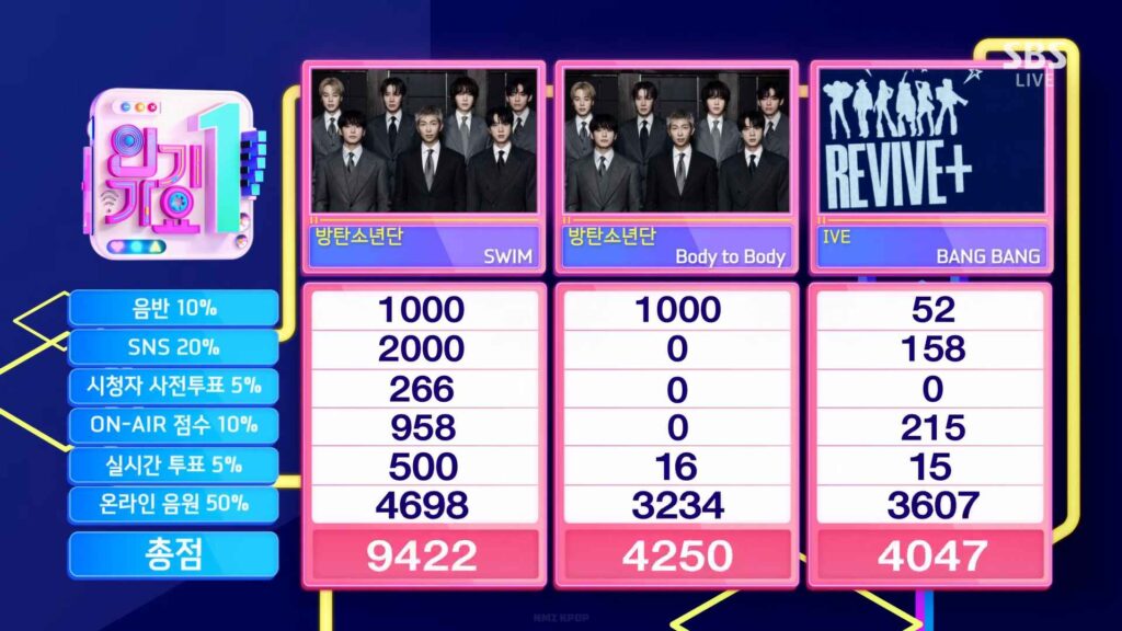 ในตอนออกอากาศวันที่ 5 เมษายน คู่แข่งที่ลงมาประชันชิงอันดับ 1 มีทั้ง “SWIM” ของ BTS, “Body to Body” ของ BTS เองอีกหนึ่งเพลง และ “BANG BANG” ของ IVE ซึ่งเรียกได้ว่าเป็นศึกของตัวจริงกันทั้งนั้น แต่สุดท้ายก็เป็น “SWIM” ที่พุ่งเข้าเส้นชัยด้วยคะแนนรวม 9,422 คะแนน คว้าชัยไปแบบเด็ดขาด