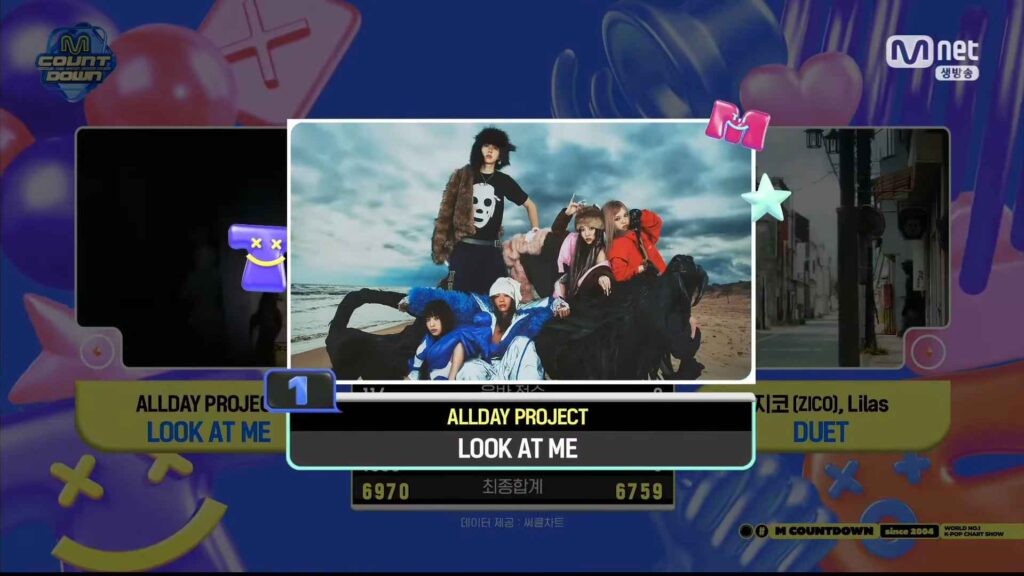 เรียกได้ว่าเป็นโมเมนต์ที่แฟน ๆ ต้องเปิดคลิปวนซ้ำกันทั้งไทม์ไลน์ เมื่อรายการ M Countdown ออกอากาศวันที่ 8 มกราคม ประกาศผลผู้ชนะประจำสัปดาห์ และชื่อที่ถูกขานขึ้นบนเวทีก็คือ ALLDAY PROJECT กับซิงเกิลฮิตติดหู “LOOK AT ME” ที่สามารถคว้าถ้วยรายการเพลงแรกในชีวิตได้สำเร็จ ท่ามกลางเสียงเชียร์สนั่นและน้ำตาแห่งความดีใจของเมมเบอร์