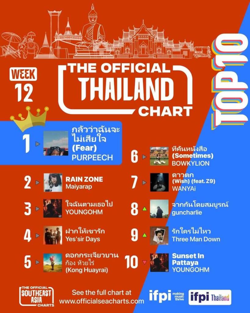 ตอนนี้ต้องยอมให้วงอินดี้มาแรงอย่าง PURPEECH แบบไม่มีข้อโต้แย้ง เพราะซิงเกิล “กลัวว่าฉันจะไม่เสียใจ (Fear)” กำลังสร้างปรากฏการณ์แรงไม่แผ่ว หลังพุ่งขึ้นครองอันดับ 1 บนชาร์ต The Official Thailand Chart ติดต่อกันยาวนานถึง 8 สัปดาห์รวด กลายเป็นหนึ่งในเพลงที่ทรงอิทธิพลที่สุดของช่วงเวลานี้ และย้ำชัดว่าเพลงอินดี้ไทยก็สามารถยืนระยะบนชาร์ตหลักได้อย่างสง่างามไม่แพ้ใคร