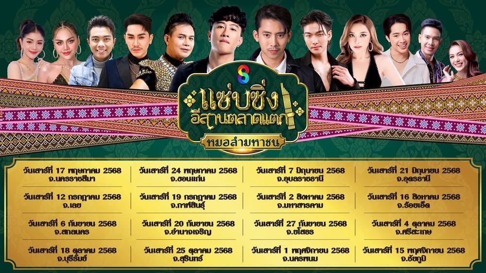 ถึงคิวภาคอีสานกันบ้างกับงาน “แซ่บซิ่ง อีสานตลาดแตก หมอลำมหาชน” เวทีหมอลำอีสานขนานแท้ที่ยืนหยัดเดือนสายกระจายความม่วนทั่วภาคอีสานแบบแซ่บอิหลีมาอย่างยาวนาน พร้อมฉลองครบรอบ 9 ปีทอง แบบสมฐานะ ด้วยมหกรรมวัฒนธรรมอีสานออนทัวร์ 16 จังหวัดภาคอีสาน พร้อมจะสร้างบรรทัดฐานใหม่ “วิกแตก” แบบไม่มีใครเทียบ ที่กล้าพูดว่าเป็นหนึ่งเดียวที่รู้ใจพี่น้องชาวอีสานเป็นอย่างดี พร้อมขนศิลปินพี่น้องชาวอีสานขวัญใจมหาชนที่จะมาฟาดฟันประชันฝีมือเหล่าซุปตาร์อินดี้อีสานพันล้านวิว อาทิ เบิ้ล ปทุมราช, เม้ก อภิสิทธิ์, แซค ชุมแพ, ตรี ชัยณรงค์, แอน อรดี พร้อมการมาของคณะหมอลำชื่อดังมหาชน ระดับท็อป 5 ภาคอีสาน มาม่วนแบบแซ่บซิ่งอีสานตลาดแตก พร้อมมาขนขบวนสร้างความครื้นเครง ฟ้อนวง ตั้งลำแซ่บหลาย โดยจะประเดิมที่แรก จังหวัดนครราชสีมา ในวันเสาร์ที่ 17 พฤษภาคม ต่อเนื่อง จังหวัดขอนแก่น ในวันเสาร์ที่ 24 พฤษภาคม, จังหวัดอุบลราชธานี ในวันเสาร์ที่ 7 มิถุนายน, จังหวัดอุดรธานี ในวันเสาร์ที่ 21 มิถุนายน, จังหวัดเลย ในวันเสาร์ที่ 12 กรกฎาคม, จังหวัดกาฬสินธุ์ ในวันเสาร์ที่ 19 กรกฎาคม, จังหวัดมหาสารคาม ในวันเสาร์ที่ 2 สิงหาคม, จังหวัดร้อยเอ็ด ในวันเสาร์ที่ 16 สิงหาคม, จังหวัดสกลนคร ในวันเสาร์ที่ 6 กันยายน, จังหวัดอำนาจเจริญ ในวันเสาร์ที่ 20 กันยายน, จังหวัดยโสธร ในวันเสาร์ที่ 27 กันายนยน, จังหวัดศรีสะเกษ ในวันเสาร์ที่ 4 ตุลาคม, จังหวัดบุรีรัมย์ ในวันเสาร์ที่ 18 ตุลาคม, จังหวัดสุรินทร์ ในวันเสาร์ที่ 25 ตุลาคม, จังหวัดนครพนม ในวันเสาร์ที่ 1 พฤศจิกายน ปิดท้ายความยิ่งใหญ่ จังหวัดชัยภูมิ ในวันเสาร์ที่ 15 พฤศจิกายน