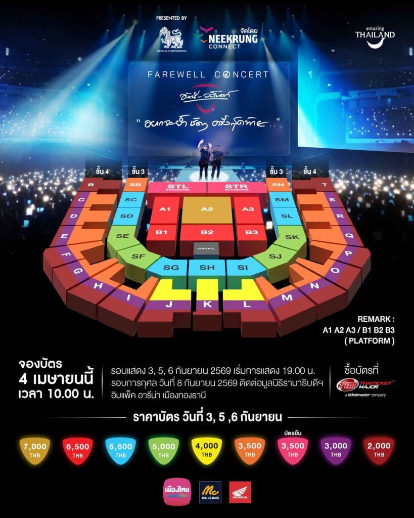 สำหรับใครที่เติบโตมากับเสียงร้องและกีตาร์ของ อัสนีและวสันต์ งานนี้คือโอกาสครั้งใหญ่ที่จะได้เก็บโมเมนต์สุดท้ายไว้ในความทรงจำร่วมกันบนอารีนาใหญ่แบบเต็มอารมณ์ และถ้าอิงจากข้อมูลทางการของไทยทิคเก็ตเมเจอร์ คอนเสิร์ตถูกวางให้เป็น “รอบสุดท้ายที่ต้องจบลงด้วยคำอำลา” อย่างแท้จริง ซึ่งยิ่งทำให้บรรยากาศของงานนี้ยิ่งมีน้ำหนักมากกว่าคอนเสิร์ตปกติหลายเท่า