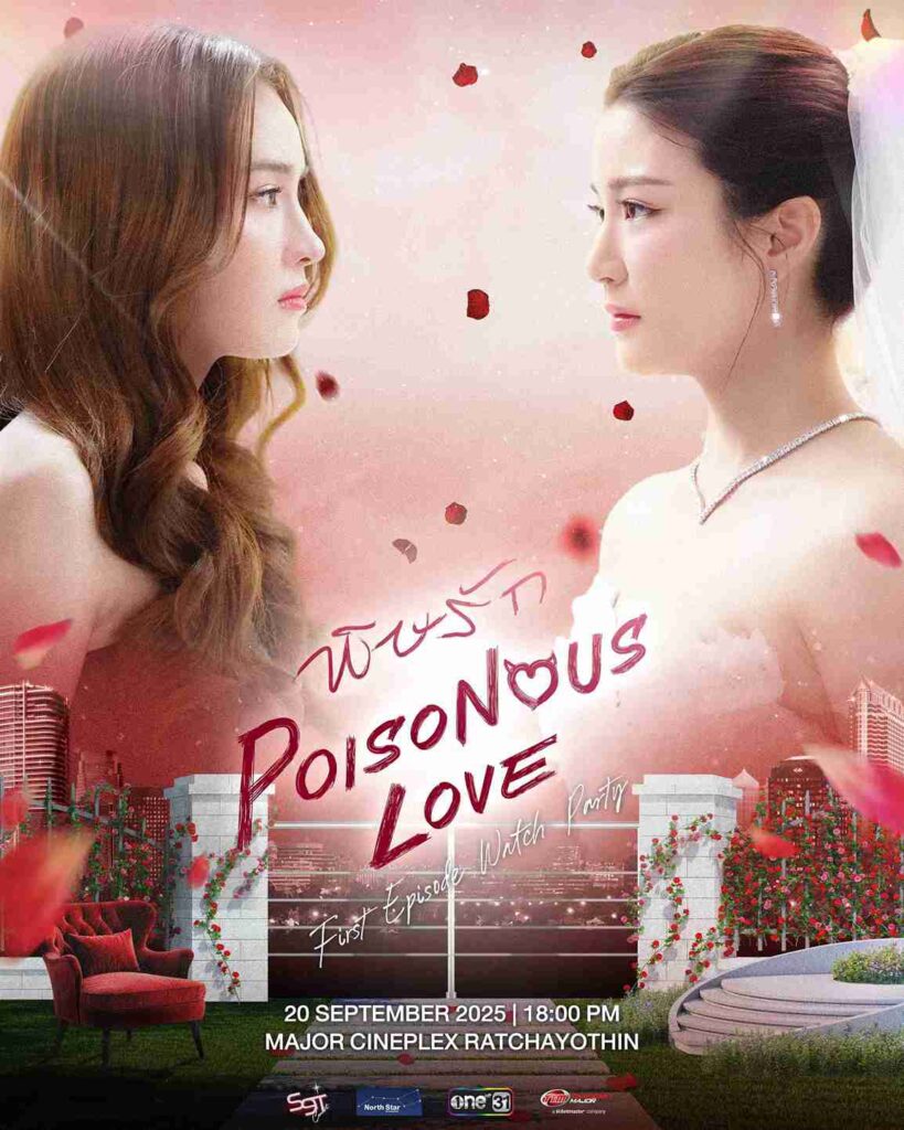 s9tConcert โปรโมเตอร์คอนเสิร์ตนานาชาติและแฟนมีตติ้งชั้นนำของเมืองไทย จึงขอชวนแฟน ๆ มาร่วมรับชมตอนแรกพร้อมกันแบบจอใหญ่-หัวใจเต้นแรง และสัมผัสโมเมนต์สุดพิเศษในงาน “Poisonous Love First Episode Watch Party” ในวันเสาร์ที่ 20 กันยายน 2568 เวลา 18.00 น. ณ เมเจอร์ ซีนีเพล็กซ์ รัชโยธิน (โรงที่ 13) พร้อมร่วมพูดคุยและชมโชว์จากคู่จิ้นเคมีสุดแรง “จินนี่-เจน่า” ร่วมด้วยนักแสดง อาทิ ธัญทิพย์ ทวีสินธนัตย์ (มิว), เวโรนิก้า ปากาโน (เรเน่) และ พัชร์สิตา เพิงคง งานนี้รับรองว่าแฟนๆ จะได้รับความสุขแบบเต็มอิ่มเพราะนี่ไม่ใช่แค่ซีรีส์ แต่คือประสบการณ์แห่งรักที่คุณจะไม่มีวันลืม