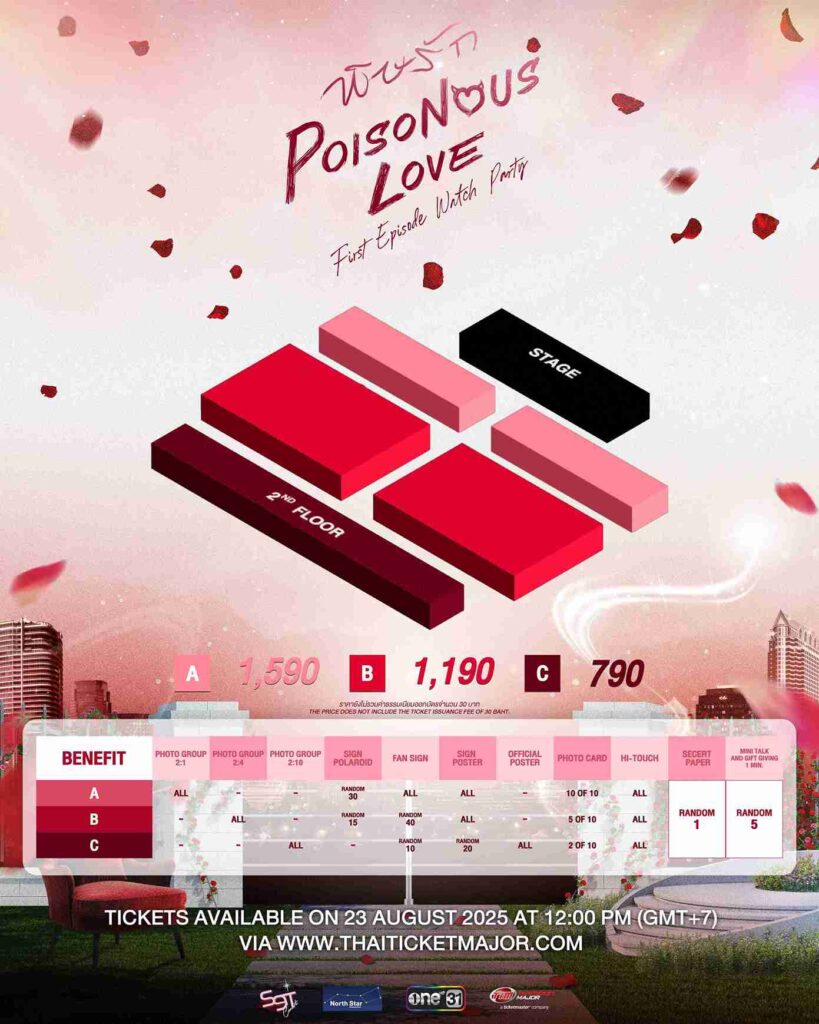 สำหรับผู้ที่สนใจสามารถจับจองบัตรเข้าร่วมงาน “Poisonous Love First Episode Watch Party” โดยจะเปิดจำหน่ายบัตรในวันเสาร์ที่ 23 สิงหาคม 2568 ตั้งแต่เวลา 12:00 น. เป็นต้นไป บัตรราคา 1,590 / 1,190 / 790 บาท ทาง ไทยทิคเก็ตเมเจอร์ ทุกสาขา และติดตามรายละเอียดเพิ่มเติมได้ที่ เว็บไซต์ : www.thaiticketmajor.com, Facebook / Instagram / X / TikTok / YouTube : s9tconcert
