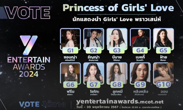 บริษัท อสมท จำกัด (มหาชน) ร่วมกับ บริษัท โซนิกซ์ ยูธ จำกัด โดย ก้อง-ปิยะ เศวตพิกุล จัดงานประกาศรางวัล “Y Entertain Awards 2024 presented by JisuLife” พร้อมผลักดันบันเทิง Y สู่ระดับสากล โดยพร้อมเปิดโผ เปิดโหวต ผู้เข้ารอบรางวัล “Y Entertain Awards 2024 presented by JisuLife” สาขารางวัล Princess of Girls’ Love (นักแสดงนำ Girls’ Love พราวเสน่ห์)