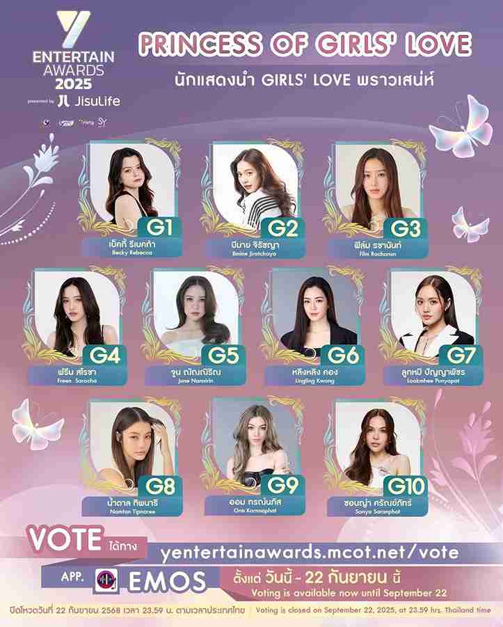 บริษัท อสมท จำกัด (มหาชน) ร่วมกับ บริษัท โซนิกซ์ ยูธ จำกัด โดย ก้อง-ปิยะ เศวตพิกุล จัดงานประกาศรางวัล “Y Entertain Awards 2025 presented by JisuLife” พร้อมเปิดโผ เปิดโหวตผู้เข้ารอบ เข้าชิงสาขารางวัล Princess of Girls’ Love (นักแสดงนำ Girls’ Love พราวเสน่ห์)