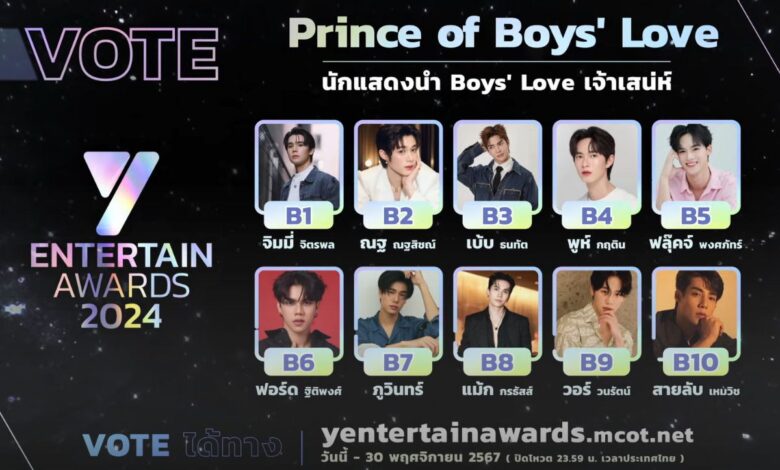 บริษัท อสมท จำกัด (มหาชน) ร่วมกับ บริษัท โซนิกซ์ ยูธ จำกัด โดย ก้อง-ปิยะ เศวตพิกุล จัดงานประกาศรางวัล “Y Entertain Awards 2024 presented by JisuLife” พร้อมผลักดันบันเทิง Y สู่ระดับสากล โดยพร้อมเปิดโผ เปิดโหวต ผู้เข้ารอบรางวัล “Y Entertain Awards 2024 presented by JisuLife” สาขารางวัล Prince of Boys’ Love (นักแสดงนำ Boys’ Love เจ้าเสน่ห์)